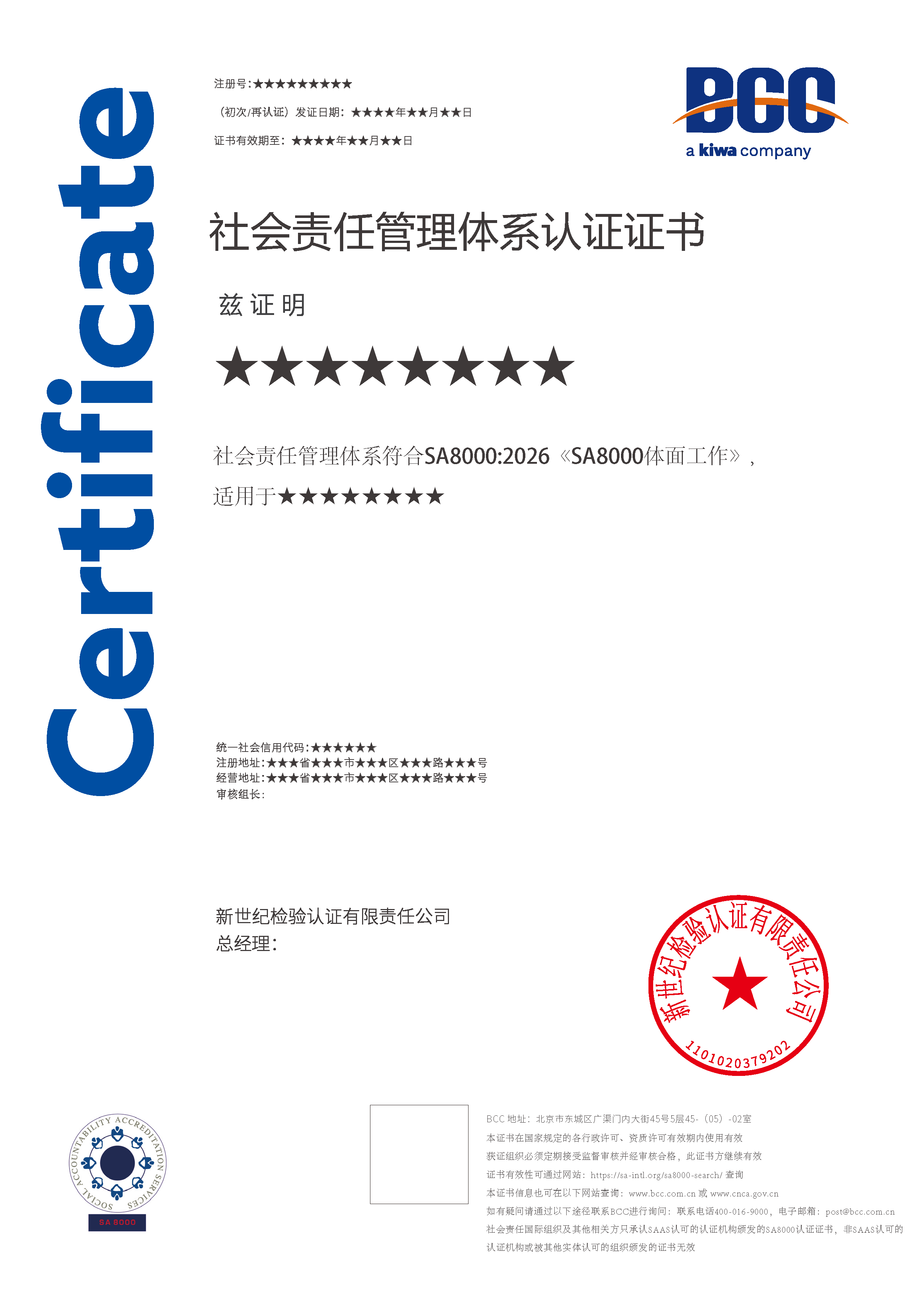 現(xiàn)行SA8000認(rèn)證使用的標(biāo)準(zhǔn)是SA8000:2014,該標(biāo)準(zhǔn)是由美國(guó)SAI(社會(huì)責(zé)任國(guó)際組織)制定發(fā)布的。SA8000標(biāo)準(zhǔn)涵蓋九個(gè)方面:童工、強(qiáng)迫勞動(dòng)、健康與安全、結(jié)社自由及集體談判的權(quán)利、歧視、懲罰措施、工作時(shí)間、報(bào)酬和管理體系。