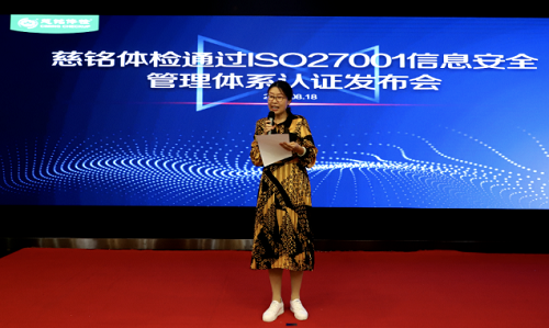 慈銘集團副總裁、信息管理中心總經(jīng)理韓濱女士在發(fā)言中首先對BCC審核老師專業(yè)的審核能力,積極認真的工作態(tài)度給予充分的肯定,對BCC給予的寶貴意見和建議表示由衷的感謝。通過此次獲得信息安全管理體系ISO/IEC27001認證證書,慈銘更將專注于每一個關鍵風險,識別可能面臨的危險,科學高效的實現(xiàn)信息安全應用與系統(tǒng)環(huán)境的安全布局,打造中國“醫(yī)療信息安全”引領者,為客戶提供可靠、安全的健康管理和服務。