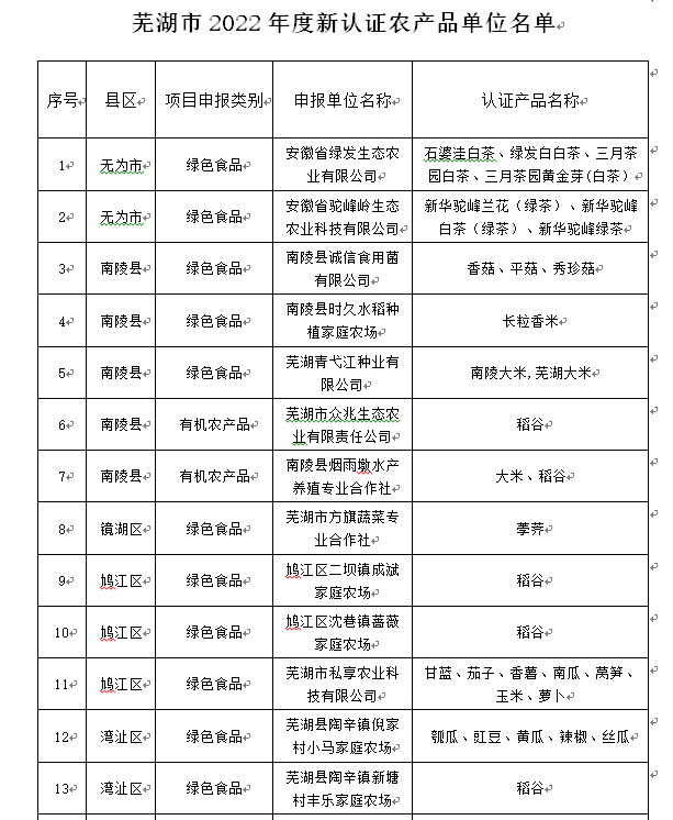 根據(jù)《蕪湖市農(nóng)業(yè)農(nóng)村局 蕪湖市財(cái)政局關(guān)于做好2022年省財(cái)政農(nóng)業(yè)高質(zhì)量發(fā)展(“兩強(qiáng)一增”行動(dòng))項(xiàng)目實(shí)施工作的通知》(市農(nóng)計(jì)財(cái)〔2022〕60號(hào))要求,經(jīng)縣(市)區(qū)農(nóng)業(yè)農(nóng)村部門申報(bào),市農(nóng)業(yè)農(nóng)村局審核,擬對(duì)蕪湖市2022年度新認(rèn)證綠色食品、有機(jī)農(nóng)產(chǎn)品、地理標(biāo)志農(nóng)產(chǎn)品的29家單位進(jìn)行公示。如下圖: