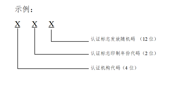 內(nèi)資認(rèn)證機(jī)構(gòu)認(rèn)證證書(shū)編號(hào)為該機(jī)構(gòu)批準(zhǔn)號(hào)的3位或4位阿拉伯?dāng)?shù)字流水號(hào);外資認(rèn)證機(jī)構(gòu)認(rèn)證證書(shū)編號(hào)為F+該機(jī)構(gòu)批準(zhǔn)號(hào)的2位或3位阿拉伯?dāng)?shù)字流水號(hào)。