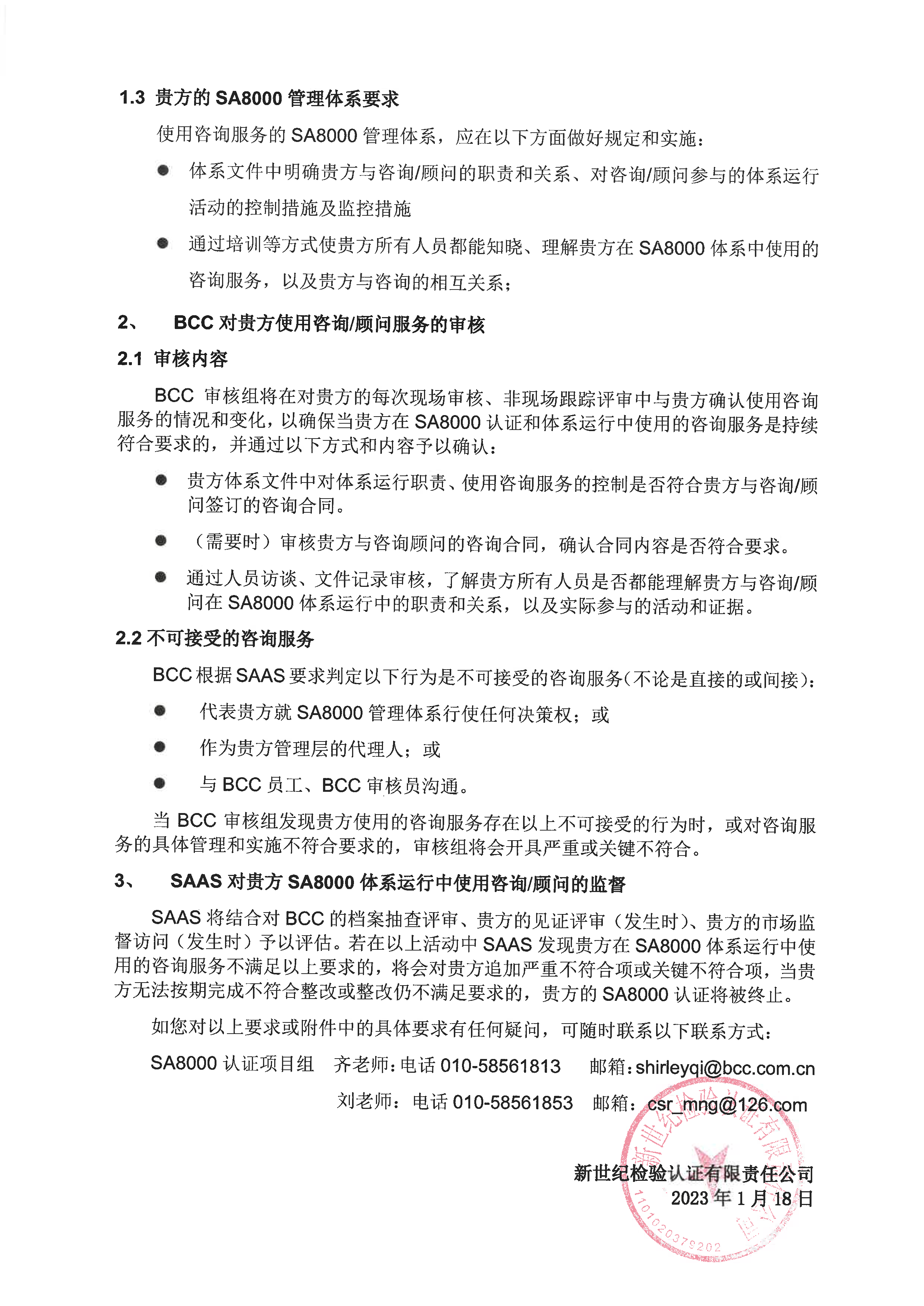 關于在SA8000體系認證中使用咨詢?nèi)藛T的告客戶書