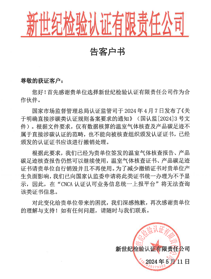 根據(jù)此要求,我們已經(jīng)為貴單位簽發(fā)的溫室氣體核查報(bào)告、產(chǎn)品碳足跡核查報(bào)告仍然可以繼續(xù)使用,溫室氣體核查證書、產(chǎn)品碳足跡 證書請(qǐng)貴單位自行銷毀并且不再使用。為了減少撤銷證書對(duì)貴單位產(chǎn) 生負(fù)面影響,我們已向國(guó)家認(rèn)監(jiān)委申請(qǐng)將此類證書統(tǒng)一辦理為不予顯示,因此,在 “ CNCA 認(rèn)證認(rèn)可業(yè)務(wù)信息統(tǒng)一上報(bào)平臺(tái) “ 將無法查詢?cè)擃愖C書信息。