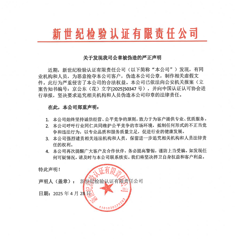 近期,新世紀檢驗認證有限責任公司(以下簡稱 “本公司 ” )發(fā)現(xiàn),有同業(yè)機構和人員,為惡意搶奪本公司客戶,偽造本公司公章,制作相關虛假文件。此行為嚴重侵害了本公司的合法權益。本公司已依法向公安機關報案(立案告知書編號: 京公東(花)立字[2025]50347號),并向中國認證認可協(xié)會進行舉報,堅決要求追究相關機構和人員偽造本公司印章的法律責任。