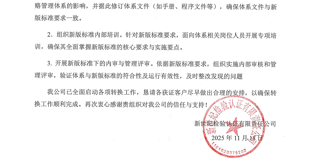 2.2025年12月31日(含當(dāng)日)前,我公司仍然受理舊版標(biāo)準(zhǔn)的申請(包括初審、監(jiān)督和再認(rèn)證申請)。
