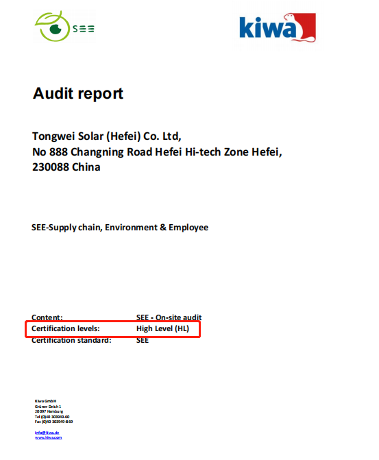作為全球認證領域20強企業(yè),Kiwa集團專家與Kiwa BCC專家對企業(yè)進行了現(xiàn)場審核、通過員工訪談,以及文件評審等工作,最終為通威太陽能頒發(fā)了首份依據(jù)SEE標準的ESG現(xiàn)場評估報告,并高度評價了通威太陽能在ESG管理方面的突出表現(xiàn)。報告涵蓋可持續(xù)的企業(yè)治理、供應鏈管理、員工權益、環(huán)境管理四個部分,總計約50個主題,在全球范圍內(nèi)有著較高且廣泛的客戶接受度和權威公信力。